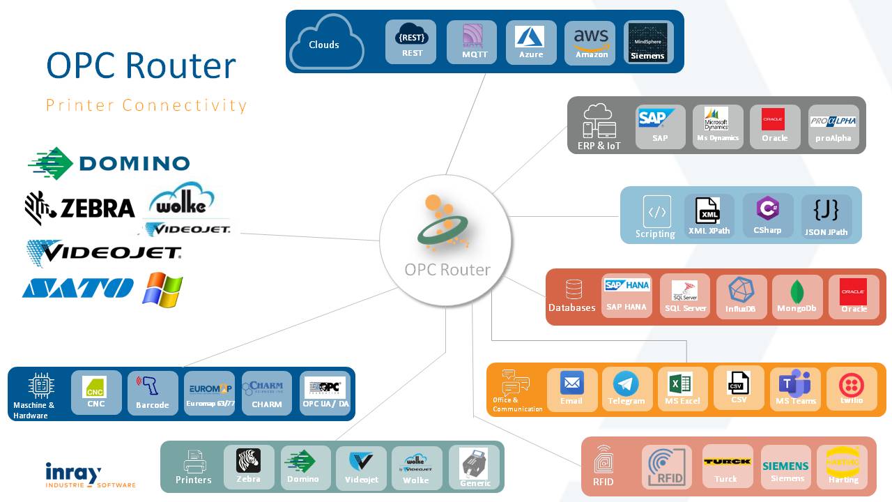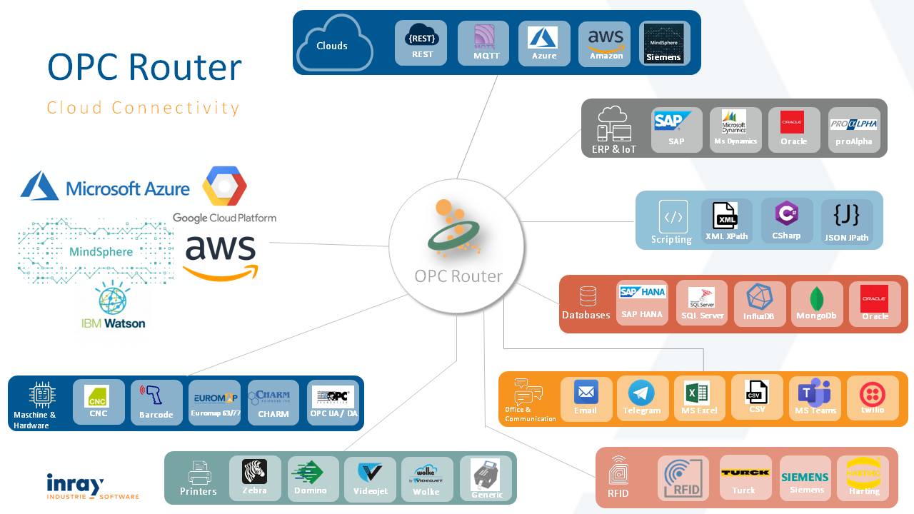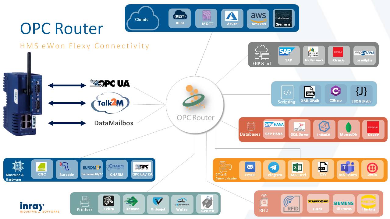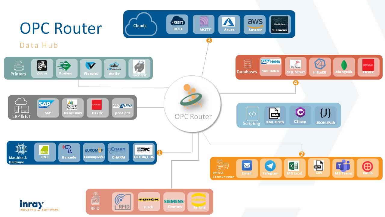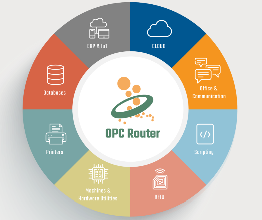 OPC 路由器是一款软件路由器,用于在 OPC 服务器(以及PLC)和数据库(以及MES、ERP 或其他业务管理软件)之间进行数据路由。其他插件连接 SAP 系统和邮件服务器、打印标签、更新 excel 文件(或创建它们)、与 Web 服务通信或处理用于自定义连接的单个脚本。 每个插件的 OPC 路由器许可证在连接数量、数据传输数量和数量方面不受限制。 数据传输由时间、事件、位或脚本触发。